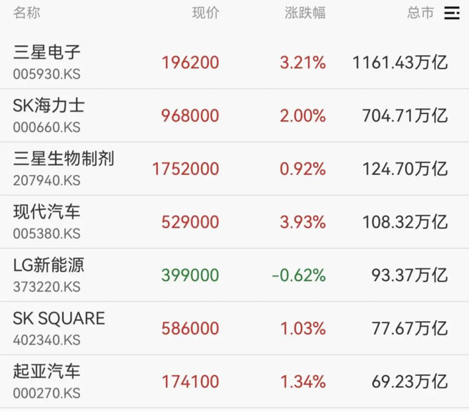 权重股方面,三星电子、现代汽车股价上涨逾3%,SK海力士涨2%。