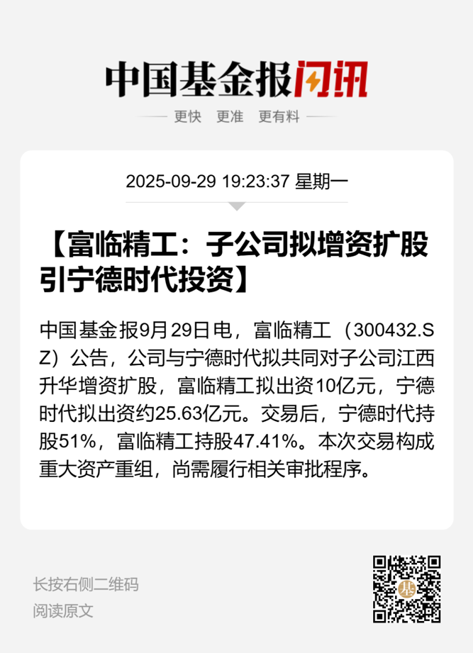 9月29日晚间,富临精工公告称,公司与宁德时代拟共同对子公司江西升华新材料有限公司(以下简称江西升华)增资扩股,预计构成重大资产重组。