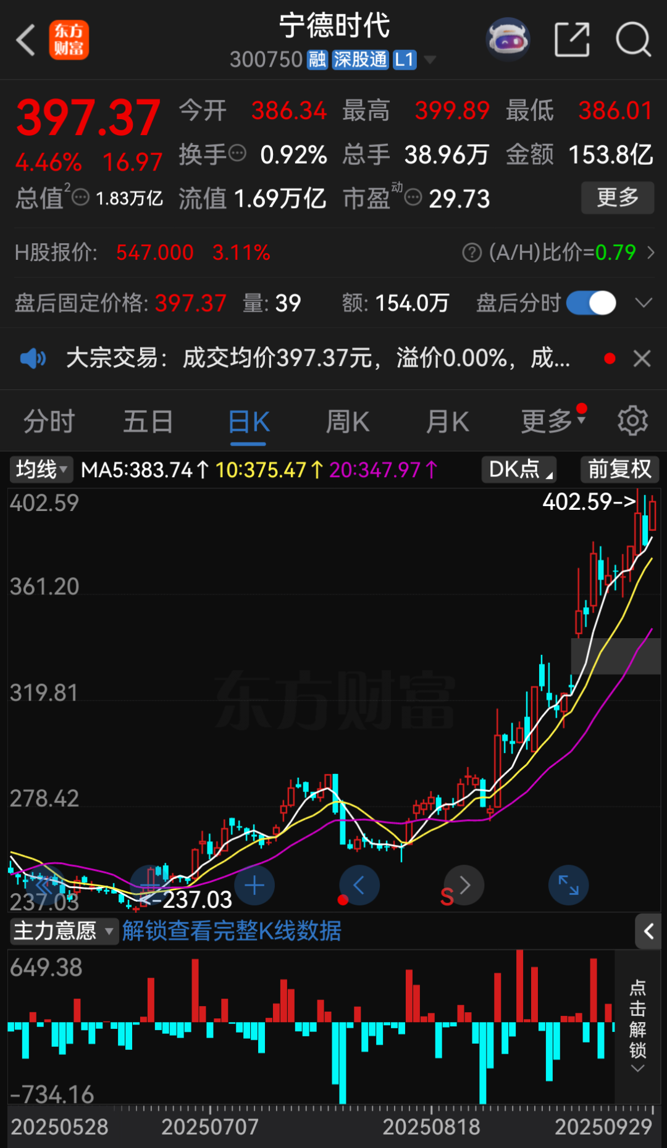 截至9月29日收盘,宁德时代A股股价报397.37元/股,涨幅达4.46%,总市值为1.83万亿元。