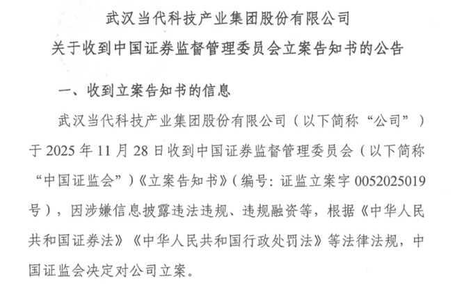 12月2日,武汉当代科技产业集团股份有限公司发布公告称,其于11月28日收到中国证监会《立案告知书》。因涉嫌信息披露违法违规、违规融资等,中国证监会决定对其立案。