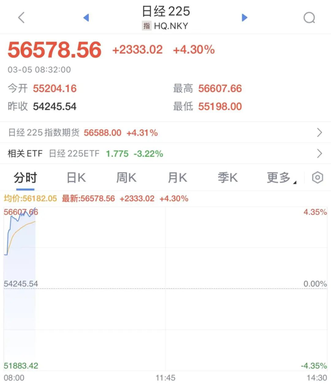 日本市场强势走高,日经225指数涨幅扩大至4%。