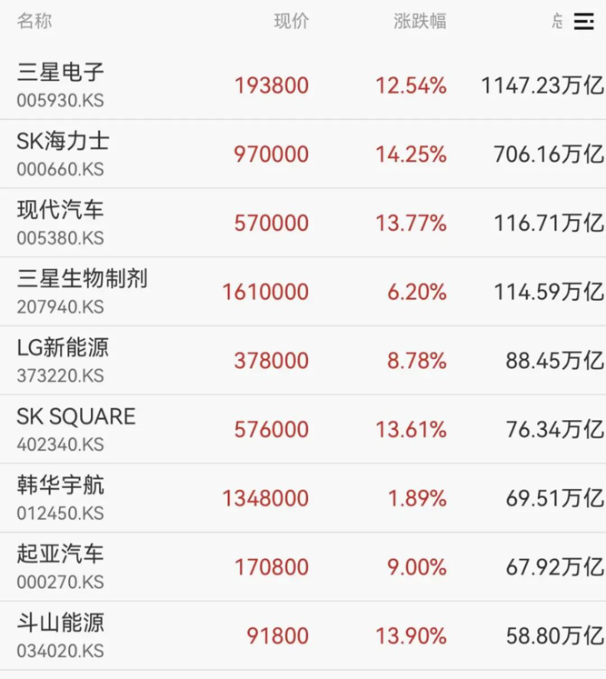三星电子、SK海力士、现代汽车股价均涨超12%。