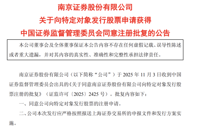 11月3日晚间,南京证券发布公告称,公司于当日收到中国证监会出具的《关于同意南京证券股份有限公司向特定对象发行股票注册的批复》。