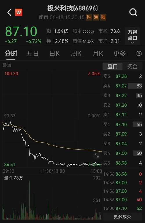 6月18日,极米科技股价略微低开后震荡下行,最终以87.1元收盘、大跌6.72%,市值跌至61亿元。
