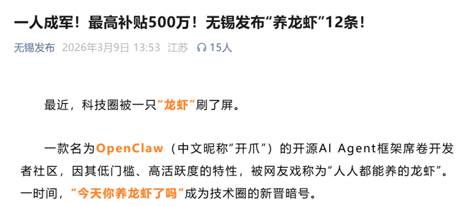 3月9日,无锡高新区发布《关于支持OpenClaw等开源社区项目与OPC社区融合发展的若干措施(征集意见稿)》。12条“养龙虾”政策,从基础支持到产业落地,从人才引育到安全合规,释放出一揽子真金白银的红利,单项支持最高达500万元。