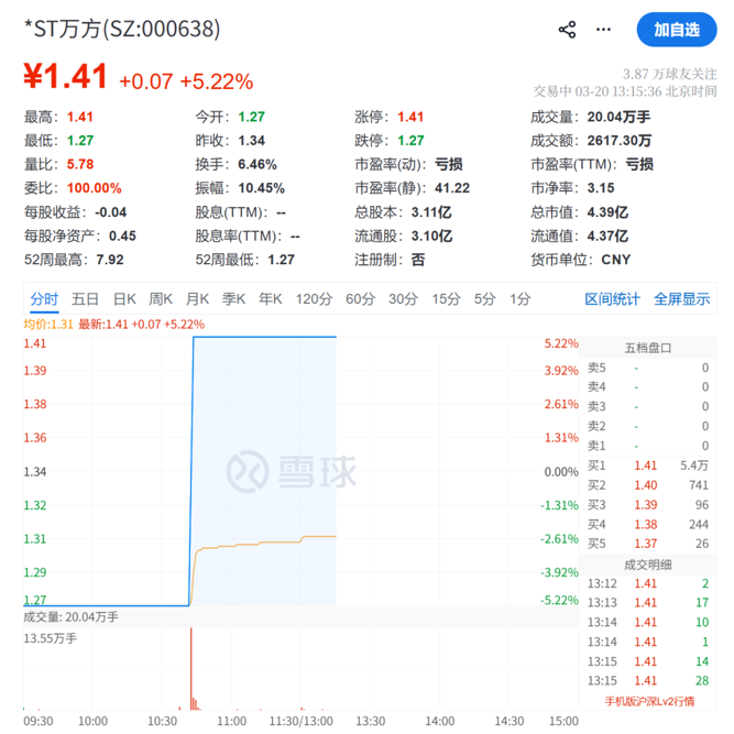 3月20日,*ST万方早间竞价跌停,报1.27元/股;10点43分左右,股价忽然拉升,1分钟内走出“地天板”,报1.41元/股,封住涨停板。
