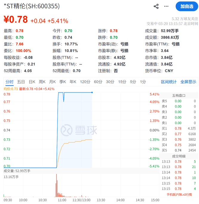 当日,*ST精伦竞价阶段跌停,报0.7元/股,开盘后继续跌停。10点53分左右,*ST精伦股价直线拉升至涨停,1分钟走出“地天板”。截至发稿,*ST精伦报0.78元/股,仍保持涨停状态。