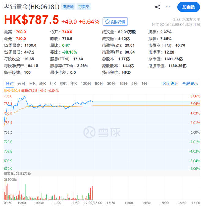 截至2月16日午间休市,老铺黄金股价报787.5港元/股,涨幅为6.64%;当前总市值为1392亿港元。