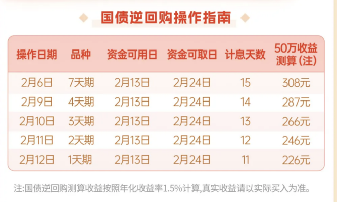 需要注意的是,2月13日是假期前最后一个交易日,如果在这个时间操作国债逆回购,投资者将享受不到假期收益。