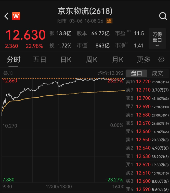 【导读】恒生科技大涨超3%,“京东系”飙升,京东物流涨幅达23%