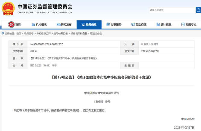 10月27日,证监会官网公布《关于加强资本市场中小投资者保护的若干意见》(以下简称《若干意见》)。