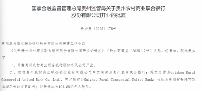 贵州农商联合银行获批开业