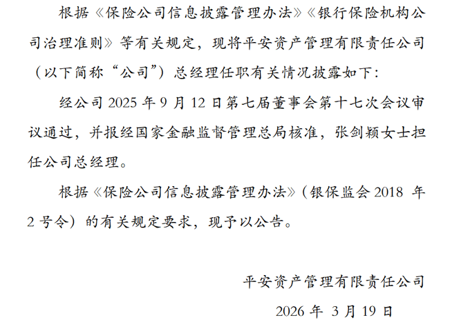3月19日,平安资管发布公告称,经公司2025年9月12日第七届董事会第十七次会议审议通过,并报经国家金融监督管理总局核准,张剑颖女士担任公司总经理。