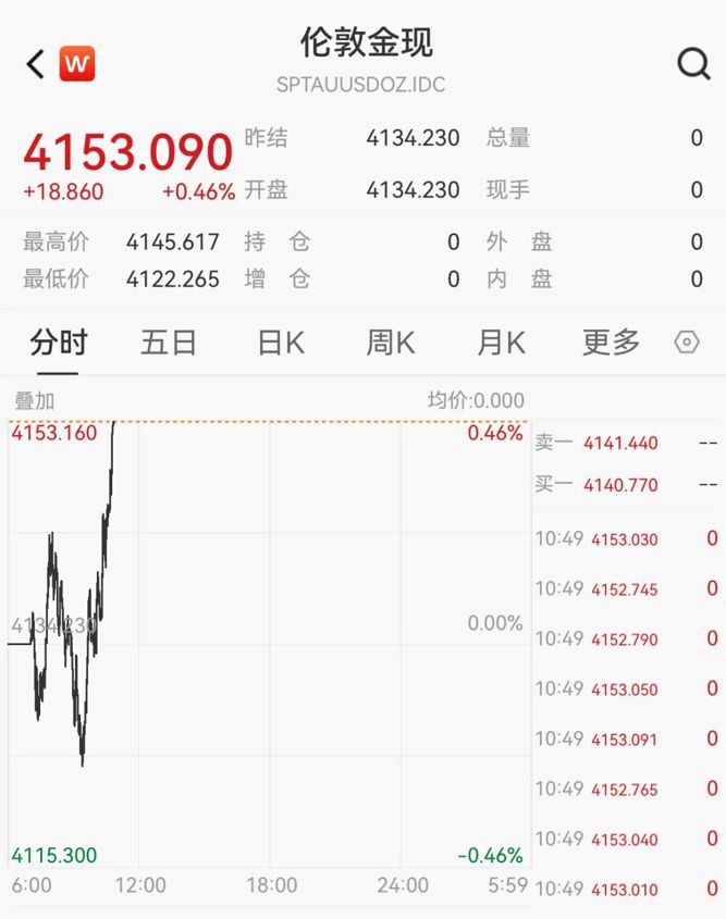 昨夜今晨,现货黄金涨势不止,从4060美元/盎司拉升至4150美元/盎司。截至记者发稿,现货黄金报4153.09美元/盎司。