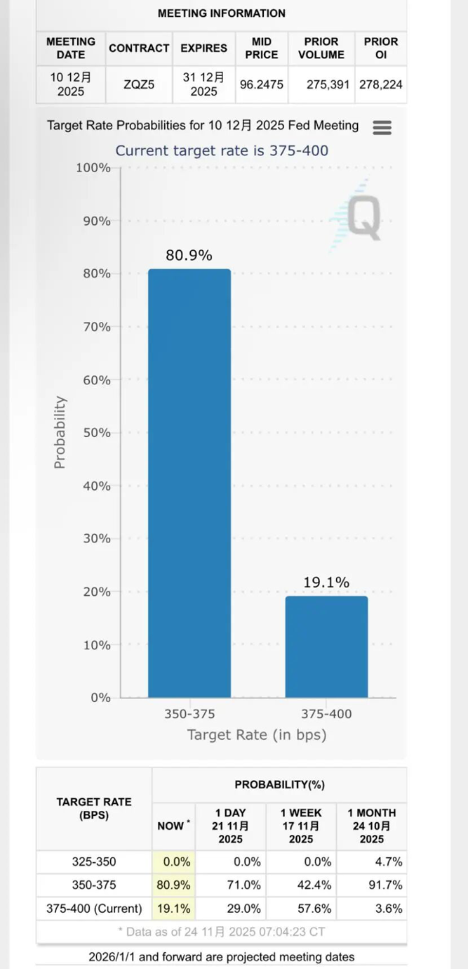 11月25日,美联储12月降息25个基点的概率升至八成。
