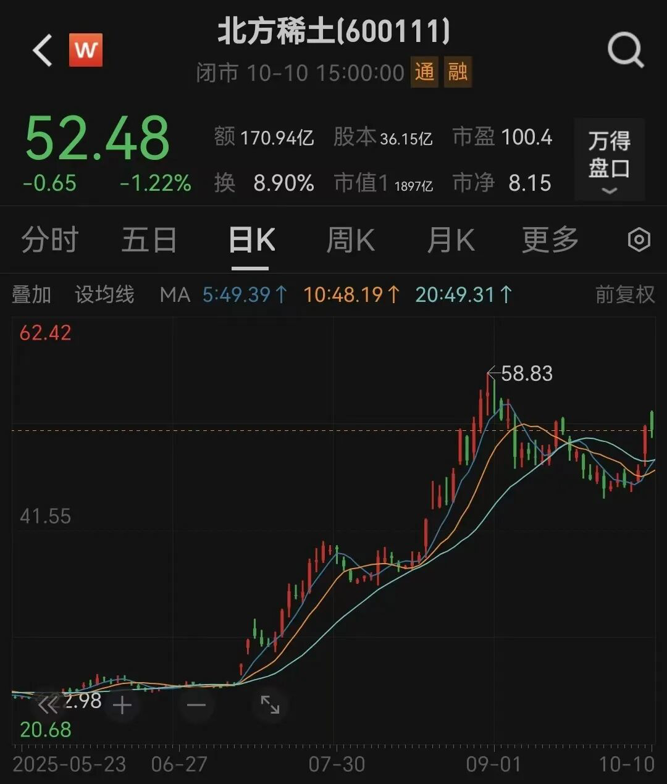 10月10日,北方稀土股价以52.48元/股报收,最新市值为1897亿元;包钢股份股价以2.54元/股报收,最新市值为1150亿元。