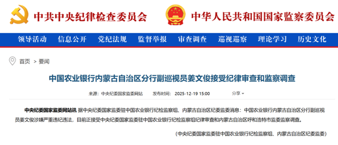 12月19日,中央纪委国家监委官网通报:中国农业银行内蒙古自治区分行副巡视员姜文俊涉嫌严重违纪违法,目前正接受中央纪委国家监委驻中国农业银行纪检监察组纪律审查和内蒙古自治区呼和浩特市监委监察调查。