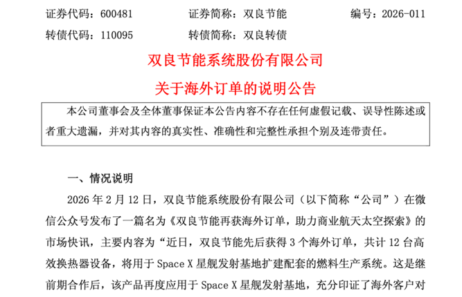 消息面上,2月12日午后,双良节能官方微信公众号发布信息称,双良节能近日先后获得3个海外订单,共计12台高效换热器设备,将用于SpaceX星舰发射基地扩建配套的燃料生产系统。这是继前期合作后,该产品再度应用于SpaceX星舰发射基地,充分印证了海外客户对双良节能产品可靠性的高度信任。