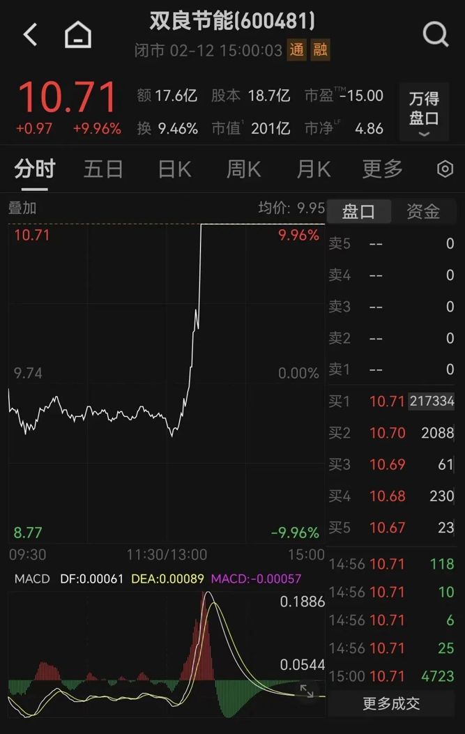 2月12日午后,双良节能股价异动,直线拉涨停。截至收盘,该股报10.71元/股,总市值为201亿元。