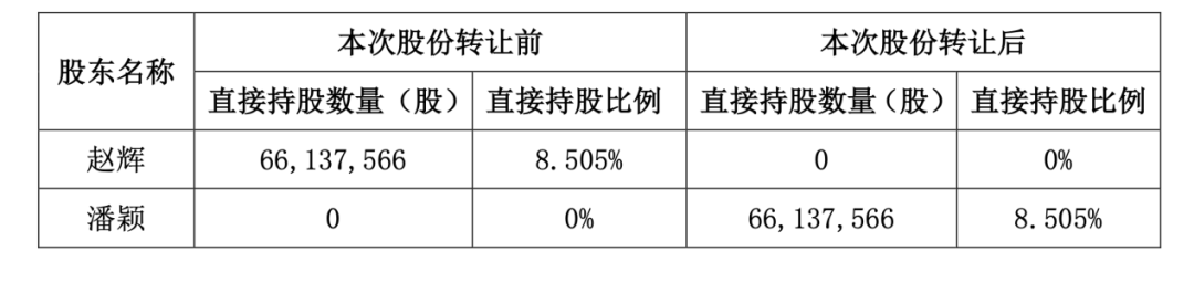 公告显示,公司于近日收到实际控制人之一赵辉的通知,赵辉已收到《证券过户登记确认书》,其已将直接持有的公司6613.76万股股份(占公司总股本的8.505%)通过证券非交易过户的方式过户登记至潘颖名下,相关手续已办理完毕。