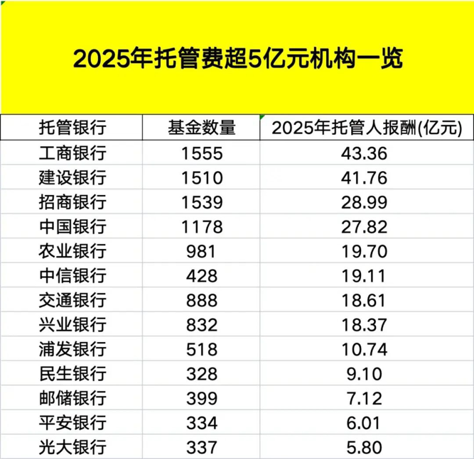 与2024年同期相比,2025年基金托管收入排名前十的机构座次发生改变。具体而言,工商银行以43.36亿元的托管费收入继续位居第一宝座,建设银行以41.76亿元位居第二,招商银行以28.99亿元跃居第三,中国银行暂降至第四,托管费收入为27.82亿元。