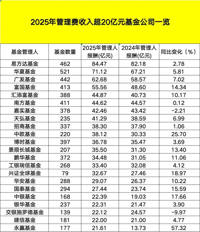 天相投顾统计显示,2025年全年,163家公募基金公司中,有15家管理费收入超过30亿元,22家超过20亿元。其中,管理规模最大的易方达基金以84.47亿元的管理费收入,在收入榜中稳居第一。