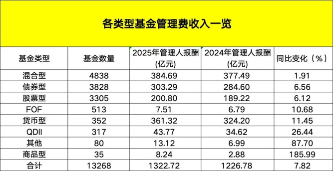 天相投顾统计显示,2025年全年基金公司管理费收入总计达到1322.72亿元,相比2024年同期的1226.78亿元增长7.82%。