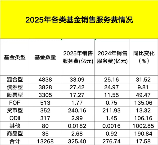 天相投顾数据显示,2025年基金销售服务费收入合计325.40亿元,较2024年同期的276.74亿元增长了17.58%。