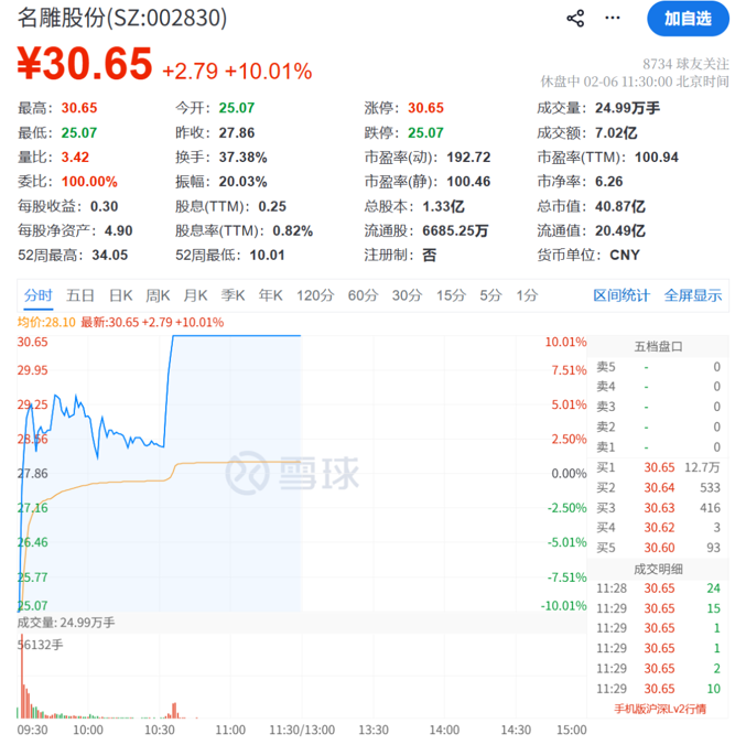 截至午间收盘,名雕股份仍保持涨停状态,报30.65元/股;半日成交额超7亿元,买一超12万手。