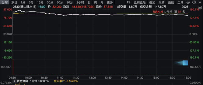 苏州旺山旺水生物医药股份有限公司今日在港交所上市,开盘报95港元/股,截至收盘,报82港元/股,大涨145.73%。