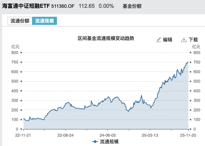 Wind数据显示,截至11月20日,海富通短融ETF规模达到700.01亿元,相比前一个交易日增长4.3亿元,一举突破700亿元大关,成为首只700亿元级债券ETF。