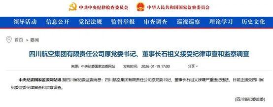 1月19日,据四川省纪委监委消息:四川航空集团有限责任公司(以下简称川航集团)原党委书记、董事长石祖义涉嫌严重违纪违法,目前正接受四川省纪委监委纪律审查和监察调查。
